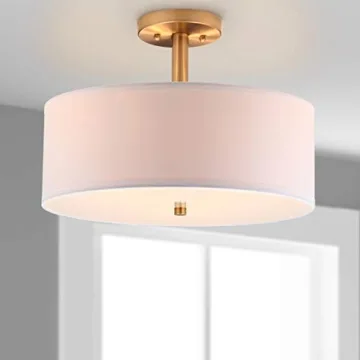 Show more Illuminate your living spaces with the exquisite SAFAVIEH Lighting Collection Clara Gold Semi Flush Mount Ceiling Light Fixture. Boasting a contemporary design, this light fixture seamlessly blends functionality with style, making it an ideal choice for any room in your home. Its elegant white cotton drum shade, complemented by gleaming gold accents, add a touch of sophistication to your décor. The inclusive LED bulb provides a long-lasting performance of up to 25,000 hours, consuming 90% less energy compared to traditional bulbs, making it not only a practical choice but also a sustainable one. With dimensions perfectly sized at 16" wide, 16" deep, and 11.25" high, this fixture blends effortlessly into your living space, providing a warm, cozy ambiance.