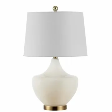 Show more The Safavieh Lighting Collection Demra Table Lamp is more than just a lighting source; it's a stylish statement piece that enhances the ambiance of your room. With its elegant gourd silhouette crafted in clean white glass and complemented by a stunning gold base, this lamp radiates sophistication and charm. Measuring 15 inches wide, 15 inches deep, and 25 inches high, it's the perfect addition to brighten up bedrooms, living rooms, entryways, or home offices. Not only does it elevate your décor, but it also comes with a high-efficiency LED bulb that lasts 25,000 hours and uses 90% less energy than standard bulbs. With a classic on/off rotary switch, its functionality matches its aesthetic appeal, making it a must-have for any modern home.