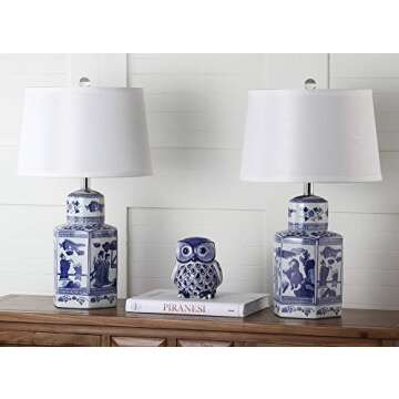 Show more Introducing the SAFAVIEH Lighting Collection Judy Chinoiserie Table Lamp Set, a stunning addition to your home decor that seamlessly blends style and functionality. This exquisite set of two lamps is designed to enhance any room's ambiance, be it your bedroom, living room, or home office. The elegant white and blue chinoiserie detailing brings a touch of classic sophistication, while the 24-inch height makes it a prominent centerpiece for desks, nightstands, or accent tables. With energy-efficient LED bulbs included, you can enjoy bright illumination without compromising on sustainability.