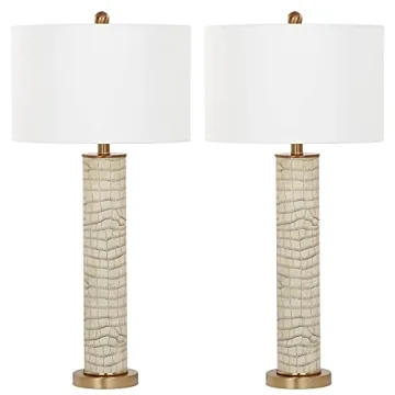 Show moreIntroducing the exquisite Safavieh Lighting Collection Ollie Cream Faux Alligator Table Lamp Set, a stunning duo that will effortlessly elevate the charm and elegance of any room in your home. Standing at 32 inches tall, these beautiful lamps are designed to make a grand statement while providing functional lighting. Crafted from durable materials with a chic off-white shade, they cast a warm and inviting glow that enhances your space's ambiance. Perfect for various settings including your living room, bedroom, family room, den, library, or study, these lamps are not just functional, but also a stylish decor piece.