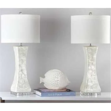 SAFAVIEH Lighting Collection Shelley Coastal White Concave Capiz Shell 31-inch Bedroom Living Room Home Office Desk Nightstand Table Lamp Set of 2 (LED Bulbs Included)