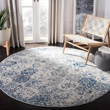 Show more Transform your home with the stunning SAFAVIEH Madison Collection Area Rug. This exquisite 6'7" round rug showcases a beautiful white and royal blue boho chic distressed design that effortlessly elevates any room's ambiance. Crafted from premium synthetic fibers, this rug is not only appealing but also remarkably durable, featuring a stain-resistant texture that ensures longevity in high-traffic areas. Embrace its non-shedding 0.4-inch pile that provides comfort and style, making it ideal for any space including your living room, bedroom, dining area, or even a cozy nursery.