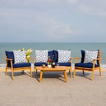 Show moreTransform your outdoor living space with the SAFAVIEH Outdoor Collection Deacon Acacia Wood Cushion 4-Piece Conversation Patio Set. This stunning set combines elegance and comfort to create an inviting atmosphere in your patio, backyard, or sunroom. Featuring a robust natural acacia wood construction, this set includes one stylish bench, one chic coffee table, and two plush chairs, all beautifully enhanced with vibrant navy cushions and matching accent pillows. Whether you're entertaining guests or enjoying a quiet evening under the stars, this versatile set will elevate your outdoor experience to new heights.