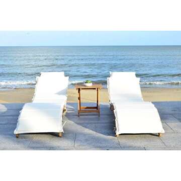 Show more Transform your outdoor space into a chic oasis with the SAFAVIEH Outdoor Collection Pacifica Chaise Lounge Set. This stunning 3-piece set features two luxurious chaise loungers paired with a stylish side table, all designed to elevate any patio, backyard, porch, sunroom, deck, or terrace. Crafted from high-quality natural acacia wood, renowned for its durability and beauty, this set combines style with functionality, making it the perfect addition to your outdoor decor. The removable plush cushions ensure ultimate comfort while you bask in the sun or unwind with a good book.