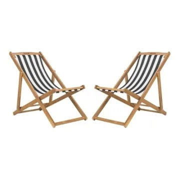 Show moreIntroducing the exquisite **Sling Chair by Safavieh**, part of the renowned **Outdoor Collection**, which perfectly marries aesthetic appeal with practical comfort. Crafted from premium Eucalyptus wood, this chair boasts a beautiful teak finish complemented by chic black and white upholstery. Designed to be the ultimate lounging companion, the ergonomic structure includes **three adjustable reclining levels**, allowing you to customize your seating for reading, relaxing, or soaking up the sun in style. The combination of sturdy construction and lightweight design means it's easy to reposition wherever you want to enjoy the outdoors.
