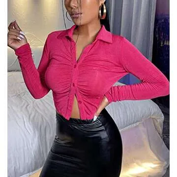 SAFRISIOR Women's Sexy Y2K Ruched Ruffle Buttons Down Collar Long Sleeve Slim Fit Crop Top Tee Shirts Blouse Cardigan (Small, Hot Pink)