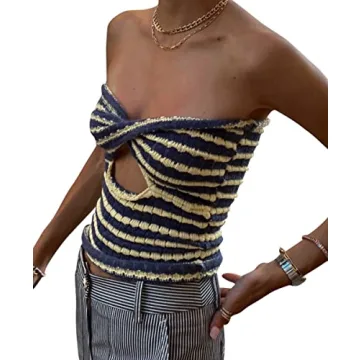 Show more Introducing the SAFRISIOR Women Striped Twist Front Knit Strapless Crop Top, your new go-to piece for effortlessly chic style! Designed in a stunning navy and yellow combination, this hollow-out front sleeveless backless tube top offers a fresh take on summertime fashion. The twist front detail adds a touch of sophistication, while the breathable knit fabric ensures comfort and flexibility, making it perfect for warm days and nights out. Whether paired with shorts or a skirt, this top exudes a playful yet classy vibe that will turn heads and make you feel fabulous.