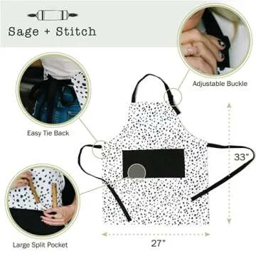 Show more Elevate your culinary experience with the Sage+Stitch Adjustable Designer Kitchen Apron, uniquely crafted to reflect your personal style while you cook. Gone are the days of drab and boring aprons; with each distinctive pattern, you can enjoy cooking in style. With a generous size of 27 inches wide and 33 inches long, it offers ample coverage to protect you from spills and splatters, whether you're baking, grilling, or crafting gourmet meals.