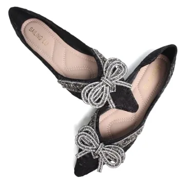Show moreStep into style with the SAILING LU Cute Bowknot Ballet Flats, a mesmerizing blend of elegance and comfort perfect for any occasion. Featuring beautiful bowknot and rhinestone embellishments on a chic pointed toe, these ballet flats are designed to elevate your footwear game. Their classical black color, combined with a touch of sparkle, makes them versatile enough to wear from morning errands to evening events without missing a beat. Crafted with a soft footbed and flexible sole, these lightweight shoes ensure all-day comfort, making them a must-have in every woman's wardrobe.