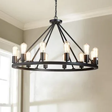 Saint Mossi 32 Inch 12 Lights Metal Chandelier Lighting Antique Painted, Rustic Vintage Farmhouse Pendant Lighting Wagon Wheel Chandelier,Black Finish,H20 x D32 with Adjustable Chain
