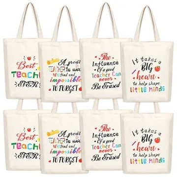 Show more Introducing the SAIWEILAI ONLINE 8 Pieces Teacher Canvas Totes Bag – the perfect way to express gratitude to the educators who shape our lives! These beautifully designed tote bags come in a vibrant array of colors, featuring heartwarming phrases that resonate deeply with anyone who has a passion for teaching. With a robust capacity to accommodate everything from lunch and books to personal items, these bags flawlessly combine practicality with sentiment. Whether for Teacher's Day, Thanksgiving, or any occasion that calls for a meaningful gesture, these bags are much more than mere carriers; they represent appreciation and support for the teaching community.