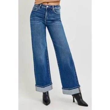 SALT TREE Risen Jeans - Tummy Control Cuffed Wide Jeans in Dark Blue
