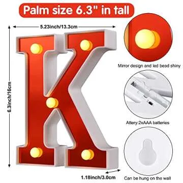 Show moreIntroducing the Samapet Light up Letters LED Marquee Letter Lights—the perfect way to illuminate your special moments with charm and delight! Designed with a stunning mirrored red surface, these 6.3 inch tall marquee letters are not just visually appealing; they also bring a warm and inviting glow to any room or event. Whether it’s a birthday party, wedding, or home decoration, these lights add a refined and romantic ambiance that transforms ordinary settings into extraordinary spaces.