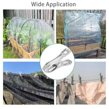 Show more Introducing the Samhopo Garden Clips, your ultimate companion for securing shade cloths, plant covers, and more with unparalleled strength and versatility. Crafted to endure the challenges of outdoor use, these clips are made from high-quality stainless steel for premium durability, ensuring they'll withstand the test of time. The design features a robust spring that provides excellent grip and reliable hold even on windy days, making them perfect for those unpredictable weather patterns.