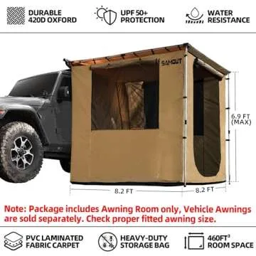 Show more Introducing the SAMOUT Vehicle Awning Room 8.2' x 8.2', a revolutionary solution for outdoor enthusiasts looking to enhance their camping experience. Crafted with rip-stop 420D Oxford fabric, this awning room is designed to withstand the elements while providing you with a durable and waterproof shelter. Use this perfect companion to your existing awning as it easily attaches to create an expansive space for relaxation or shelter during your outdoor adventures. At a generous 460ft³ of interior space, you can take a breather, organize your gear, or even set up a cozy changing area for added convenience. Whether you're stopping for a quick lunch break or enjoying an extended camping trip, this awning room is engineered for quick and easy setup, ensuring that you spend more time enjoying the great outdoors and less time fussing with complicated installations.