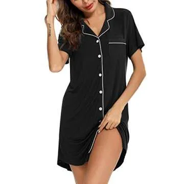 Samring Women's Nightgown Short Sleeve Sleep Nightshirt Breastfeeding Loungewear Button Down Pajama Dress Black M