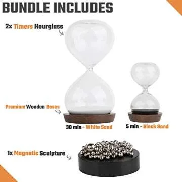 Show more Introducing our exclusive White & Black Sand Hourglass Timer Set, the ultimate desk accessory that not only serves as a stunning piece of decor but also enhances productivity. This delightful set includes a large 30-minute hourglass and a small 5-minute timer, both crafted with exquisite precision. The large hourglass stands tall at 7.1 inches, while the smaller version measures 3.9 inches, making them perfect additions to any workspace or home.