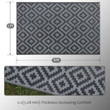 Show moreElevate your outdoor living experience with the SAND MINE Waterproof Outdoor Rug, a stunning blend of style and functionality designed to enhance any patio or deck. Measuring 5x8 ft, this plastic reversible rug features a chic black and grey lattice design, making it perfect for both contemporary and traditional settings. Made of 100% virgin polypropylene, this rug is not only low-maintenance but also offers exceptional durability and comfort, ensuring it can withstand heavy foot traffic while remaining soft underfoot.