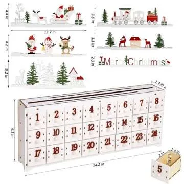 Show more Introducing the ultimate festive delight, the Wooden Advent Calendar, designed to bring joy and excitement each day leading up to Christmas! This charming decoration not only serves as a countdown but also offers endless creative possibilities. With 24 beautifully crafted numbered doors, you can fill each drawer with delightful surprises, whether it be small toys, chocolates, or heartfelt messages. Each day unveils a new treat, making the countdown to Christmas a wonderful family ritual.