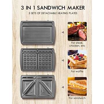 Sandwich Maker 3 in 1, Waffle Make with Removable Plate, Electric Panini Press Grill, Sandwich Toaster with Detachable Non-stick Coating, LED Indicator Lights, Cool Touch Handle, Black