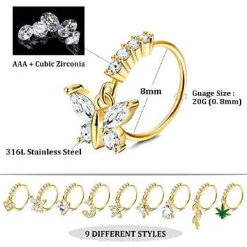 Sanfenly 9Pcs Dangle Nose Rings Hoops for Women Men 20G Stainless Steel Nose Piercing Jewelry Pink CZ Heart Moon Butterfly Dangling Nose Hoops Gold, Silver Tone