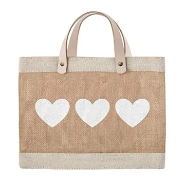 Santa Barbara Design Studio Farmers Market Tote with Three White Hearts, Reusable Burlap Grocery Bag with Leather Handle, Purse for Beach or Picnics, Food Lovers Gift Idea, 12.5 x 9.5 Inches