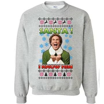 SANTA! I KNOW HIM! Ugly Christmas Sweater Buddy the Elf Sweatshirt Holiday Movie Apparel Will Ferrell Crewneck Sweatshirt