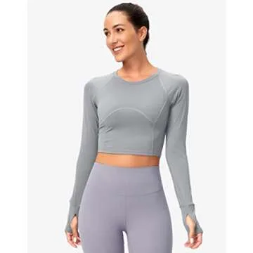 SANTINY Women's Long Sleeve Crop Workout Tops Slim Fit Gym Yoga Running Shirts for Women(Light Grey_S)