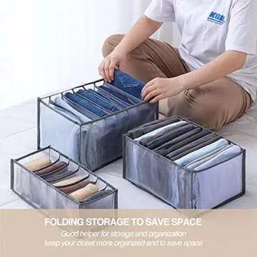 SANTUKEY Wardrobe Clothes Organizer, 7 Grids Washable Portable Closet Organizer Mesh Separation Storage Box Foldable Closet Drawer Organizer for Underwear, Socks, Jeans (Grey, 3 Leggings Grid)