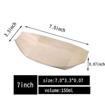 Show moreIntroducing the Sanxian Disposable Wood Boat Plates – the perfect combination of elegance and practicality for your dining experience! Measuring 7 inches long, 3.3 inches wide, and 0.7 inches high, these exquisite boat-shaped plates are designed for food lovers who appreciate both aesthetics and functionality. Each pack includes 100 plates, ensuring you’re well-prepared for any occasion. Made from high-quality birch and coated with a liquid-resistant resin on both sides, these plates boast durability and a stunning natural finish that enhances the beauty of your dining presentation.