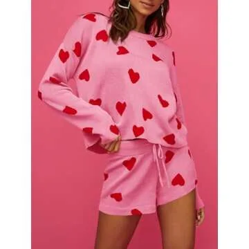Show more Experience ultimate comfort and style with this exquisite lounge set that blends softness with chic design. Made from high-quality, breathable knit fabric, this set is not only cozy but also skin-friendly, ensuring you feel warm and snug throughout the day. The captivating heart prints on the round neck top add a playful touch, while the long sleeve design is perfect for chilly evenings. Our accompanying drawstring waist shorts offer a loose fit that prioritizes comfort, making it ideal for relaxation at home.