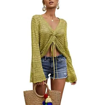Saodimallsu Womens Bell Sleeve Tops Oversized V Neck Shirts Flowy Crochet Sexy Tie Front Ruched Ruffle Top Blouse Yellow Green