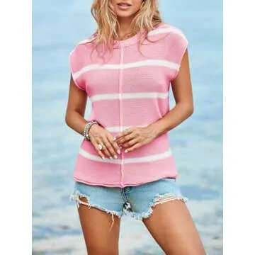 Saodimallsu Womens Cap Sleeve Sweater Vest Striped Crew Neck Casual Loose Fit Spring Summer Pullover Knit Tank Tops Pink