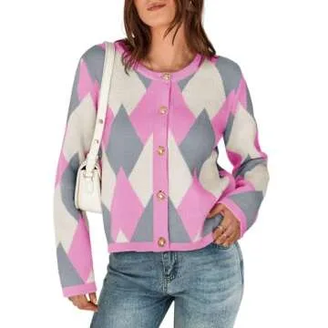 Saodimallsu Womens Color Block Cardigan Button Down Crewneck 2024 Fall Trendy Open Front Long Sleeve Sweater Jacket Pink