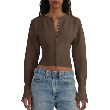 Saodimallsu Womens Cropped Sweaters Button Down Long Sleeve V Neck Ribbed Knit Slim Fit Pullover Crop Tops Brown