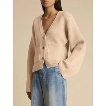 Saodimallsu Womens Deep V Neck Cardigan Sweaters Open Front Button Down Long Sleeve Cropped Knit Coats with Pockets Khaki
