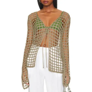 Show more Introducing the ultimate summer companion for your beach adventures, this Swimsuit Cover Up for Women is not just a garment; it is a stylish statement piece designed to enhance your warm-weather wardrobe. Crafted from soft, lightweight, and breathable acrylic, this cover-up ensures that you stay cool and comfortable as you bask in the sun's embrace. Its exquisite long sleeve design paired with a chic tie front and trendy hollow out detail makes it perfect for revealing just enough while maintaining an air of elegance.