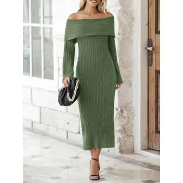 Saodimallsu Womens Off Shoulder Maxi Sweater Dress Long Sleeve Bodycon Sexy Elegant Cocktail Party Knit Dresses Army Green