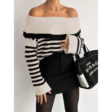 Show moreIntroducing the Saodimallsu Women's Off-The-Shoulder Sweater, the ultimate blend of style, comfort, and versatility that every wardrobe craves. This beautiful sweater features a chic striped design and a sophisticated boat neck cut, giving it an effortless elegance that's perfect for any occasion. Made from a soft, stretchy knitted fabric, it ensures a cozy wearing experience during those crisp fall and chilly winter months, while the its loose pullover fit drapes perfectly, flattering a variety of body types.