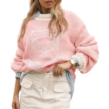 Saodimallsu Womens Oversized Chunky Sweater Crew Neck Long Sleeve Vintage Graphic Embroidered Pullover Tops Pink