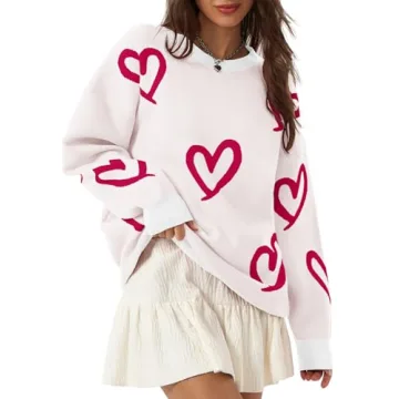 Saodimallsu Womens Oversized Heart Sweater Crew Neck Long Sleeve Knit Cute Valentines Pullover Sweaters White Red