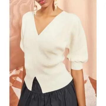 Saodimallsu Womens Puff Short Sleeve Sweaters V Neck Trendy Sexy Knit Split Hem Pullover Sweater Top Beige, Large
