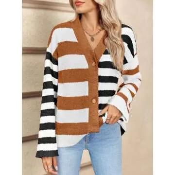 Saodimallsu Womens Striped Cardigan Sweaters V Neck Open Front Button Up Color Block Fuzzy Loose Knit Coats Brown