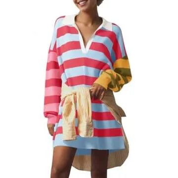 Saodimallsu Womens Striped Oversized Sweater Dress V Neck Collared Color Block Knit Long Sleeve Mini Dresses