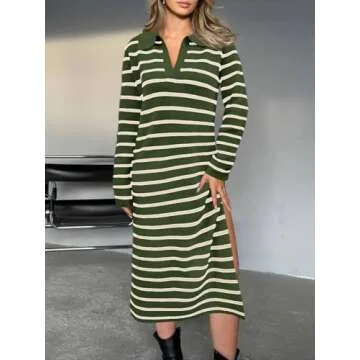 Saodimallsu Womens Striped Sweater Dress Fall Chunky Knit V Neck Collared Long Sleeve Sexy Slit Loose Midi Dresses Army Green