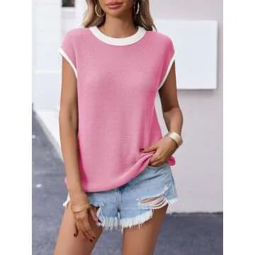 Show more Elevate your summer wardrobe with the Saodimallsu Women's Summer Cap Sleeve Knit Top. Crafted from lightweight, soft fabric, this sweater vest is designed to keep you comfortable throughout the warmer months. Its breathable and skin-friendly materials ensure that you feel great whether you’re out for a casual day or dressing up for an evening event. This trendy color block sweater vest showcases a vibrant bright pink hue with beautifully complemented accents, making it a standout piece that is both fashionable and functional. The versatile sleeveless design features a classic crew neck and rolled hem details, giving you a chic silhouette without sacrificing comfort.