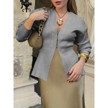 Show moreIntroducing the Saodimallsu Women’s V Neck Sweater Blazer, the ultimate blend of comfort and elegance in a long sleeve cardigan. Designed with a unique peplum silhouette, this knit open front cardigan in attractive light grey strikes the perfect balance between a casual sweater and a chic jacket. Crafted from premium stretchy knitted fabric, this cardigan stands out for its soft texture and versatility, making it suitable for any season—be it a chilly evening or a bright day in spring. With its easy hook and eye closure and flattering A-line cut, this cardigan is destined to elevate any outfit, whether it’s for work, brunch, or a cozy night out.