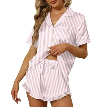 Show moreSAPJON's women's silk pajama sets redefine comfort and style for those who cherish relaxation and elegance. Made from unique satin fabric, these pajamas offer a luxurious feel reminiscent of mulberry silk, making them incredibly soft, lightweight, and breathable. The comfort of these pajamas is unmatched, providing a gentle embrace against your skin that enhances your lounging experience. The silk pj set features a classic notch collar with a full button-down design that makes it effortless to put on or take off, while the ruffled pajama shorts sport a playful bow tie and an elastic high waist for a flattering fit.