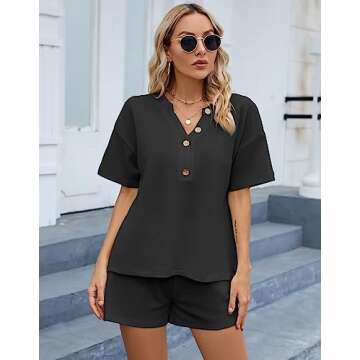 Show moreExperience ultimate comfort and style with the SAPJON Womens Pajama Sets 2 Piece Waffle Matching Lounge Sets. Crafted from a premium blend of 95% polyester and 5% spandex, this luxurious lounge set delivers a soft, elastic feel that hugs your body without sacrificing breathability. The unique waffle-knitted fabric ensures that you will stay cozy whether you’re lounging at home, running errands, or enjoying leisure time with friends. The set features a chic V-neck design and a trendy button decoration on the short-sleeve top, making it not only functional but fashionable too.