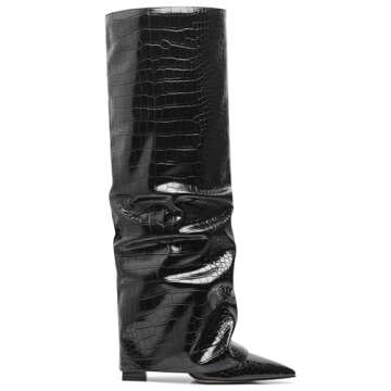 SaraIris Women's Shark Boots - Black Knee High Pointed Toe Fold Over Chunky Slouchy Boots